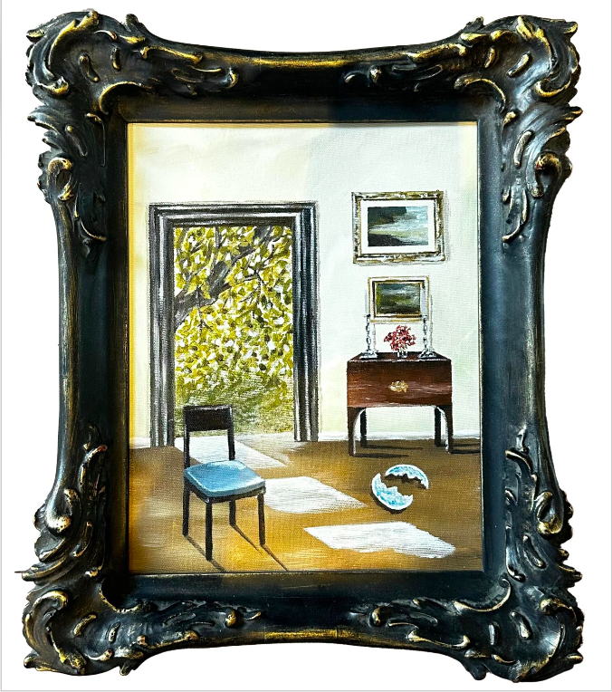 Her artistic practice investigates the fragile connections between ordinary objects of everyday life and personal memory. Interior spaces, pieces of furniture, chandeliers and ceramics appear in her works not as decorative elements, but as fragments of memory—displaced, detached, and suspended in time. By placing these objects into empty and unsettling scenes, she invites the viewer into a tense realm between the familiar and the uncanny.
