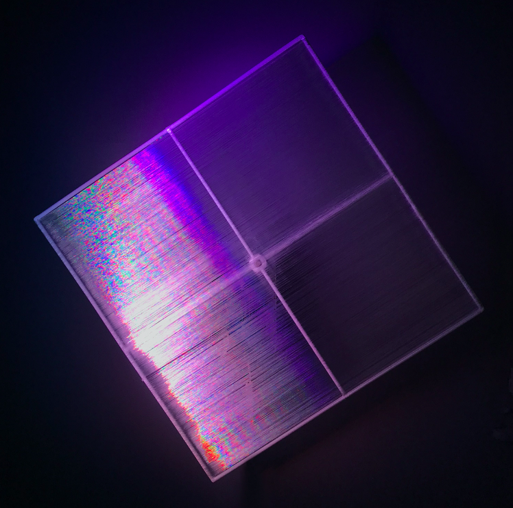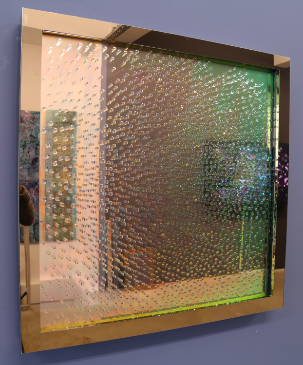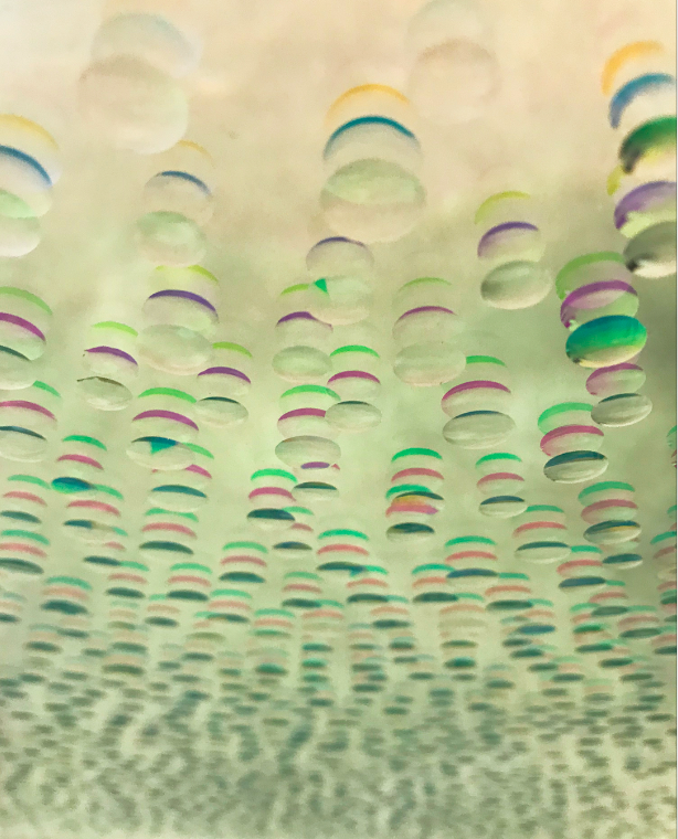Using the lenses of a microscope to show how light is slowed down and refracted; the artist introduces us to the micro-world in all its diversity. We witness not only the coming together of the micro and macro-worlds but the interplay of these through the imposition of light. Rendering the borders between the two obsolete. Our mind under siege from the micro-world does not resist it any more, instead it tends to unify with it.