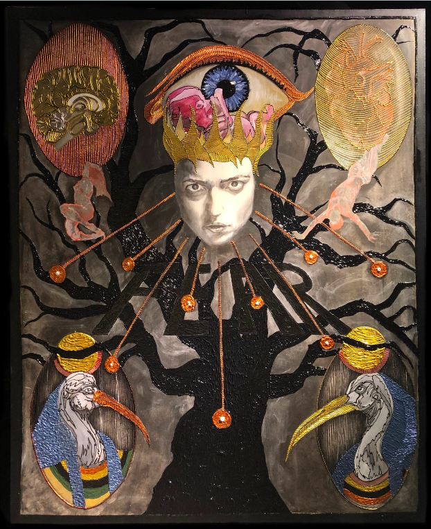 She works across a range of different mediums, including large-scale sculpture with metal welding, painting, ink drawing, and video. She weaves vintage rugs, which she uses as canvases, with brass and copper wires or she glamorizes rugs using acrylic paints like embroidery. In her latest works she often uses antique mirrors as a metaphor for confronting fears. Through this glazed glass, the artist makes us think what is hidden beyond the visible and she invites the viewer to confront with their fears through their own reflection.